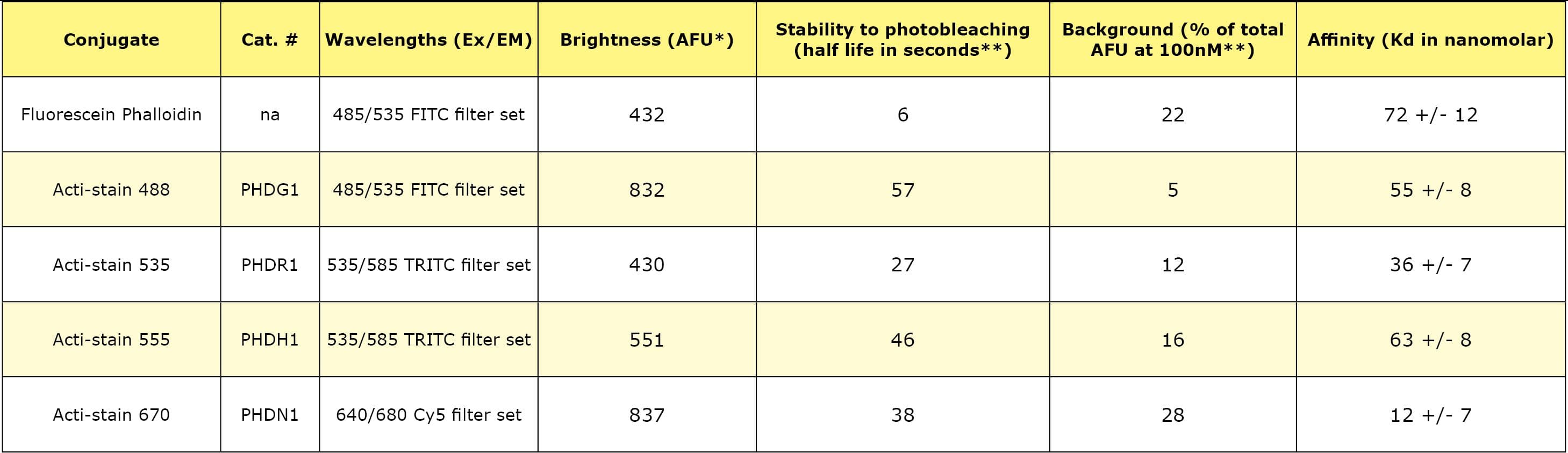 The Acti-stain™ line of fluorescent phalloidins has been developed with an emphasis on creating exceptionally bright and stable probes at an economical price. Side-by-side comparisons with leading competing products demonstrate that you will enjoy savings while not sacrificing the quality of the stain when switching to an Acti-stain™ probe. Additionally, these probes are compatible with popular filter sets such as FITC, TRITC and Cy5. The combination of in-house manufacturing, stringent quality control and convenient packaging provides a great value. Give them a try and see for yourself.