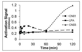 Figure 4. Time course of RhoA activation by 10 µg/ml LPA, 100 µg/ml calpeptin (Cat.# CN01) and 1 µg/ml CNF (Cat.# CN03) in Swiss 3T3 cells. Serum-starved Swiss 3T3 cells were stimulated with activator for the times shown in the graph and RhoA activation was analyzed with G-LISA kit BK121. LPA stimulation leads to a rapid and transient activation of RhoA, which peaks at 2-3 min and quickly declines to basal levels. Activation by calpeptin leads to a signal increase between 10-30 min which declines to basal after 60 min. Activation by CNF leads to signal increase after 60 min which is stable for up to 12 h.