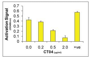 Figure 3. Rho activity measured in Swiss 3T3 cells treated with the Cell Permeable Rho Inhibitor (CT04) using the RhoA G-LISA Activation Assay (BK124). Serum starved Swiss 3T3 fibroblasts were untreated (no CT04) or treated with 0.20, 0.50 and 2.0 µg/ml of CT04 for 4 h in serum free medium at 37°C, then activated with 100 µg/ml calpeptin for 10 min. Cells were then lysed and RhoA activity was measured by the RhoA G-LISA Activation Assay (Cat.# BK124). Note: At 2.0 µg/ml CT04 for 4 h results in almost complete (90%) inhibition of RhoA activity.
