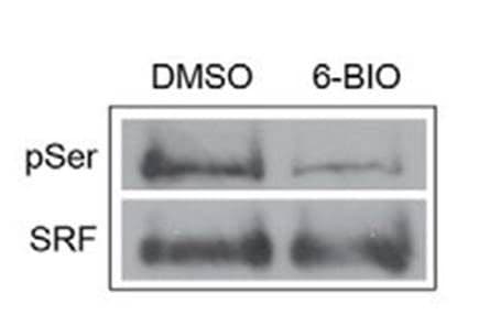 Protein specific IP utilizes an antibody against a POI to immunoprecipitate potentially all species of that protein. The enriched proteins are then separated by SDS-PAGE, transferred to a PVDF membrane, and analyzed via western blot, by probing with a target PTM antibody. Figure 2 provides example data utilizing POI-antibody specific IP, where phosho-SRF was detected using an SRF antibody for IP follwed by phospho serine antibody detection [3]. Target protein antibody IP has traditionally been the first approach used to determine if a POI is modified by a particular PTM, possibly due to the investigator's expertise with the POI specific antibody for western blot applications.