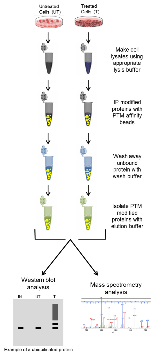 Choosing the appropriate assay, method, and/or protocol will depend on the question you are trying to answer; ultimately, it is recommended to use a combination of these methods for identification, validation, and mechanistic characterization of a PTM for a target protein. Here we provide a general overview of immunoprecipitation based PTM enrichment, as well as important technical tips. For additional information on alternative methodologies and assays used to investigate PTMs click here to see our PTM Detection Techniques Page.
