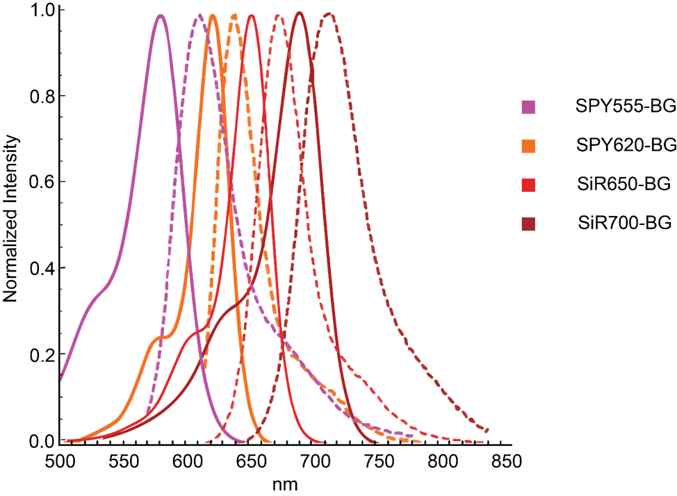 Spirochrome’s BG derivatives emit between the orange and far-red UV-ViS spectrum (Figure 1) while retaining the appealing traits of their non-BG counterparts. Spirochrome’s BG derivatives are fluorogenic, highly cell permeable, and are well suited for conventional or super resolution microscopy. One major advantage of SNAP-tag labeled proteins is the strong and stable covalent thioether bond that is not easily disrupted. These irreversible bonds create a permanent fusion between the protein of interest and the substrate even when in protein homogenates or lysates. Thus, SNAP-tagged proteins can be even loaded, detected, and quantitated with in-gel fluorescence scanning. Further, SNAP-tag fusions are versatile and can be appended to the N- or C- protein terminus avoiding disruptions in biological function.