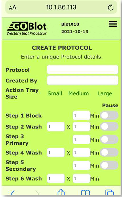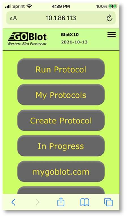 - Open the GO-Blot V2 device control panel in a browser (see Section 4 above).