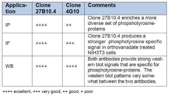 In conclusion, we have developed a new anti-phosphotyrosine mouse monoclonal antibody, clone 27B10.4 that specifically recognizes proteins post-translationally modified by phosphorylation of tyrosine residues. 27B10.4 was raised against a proprietary mixture of phosphotyrosine peptides conjugated to KLH. Comparison of 27B10.4 with the popular clone 4G10 has demonstrated that 27B10.4 has several advantages over 4G10 and is a useful new reagent for the investigation of tyrosine phosphorylation in a wide range of applications (Table 1).