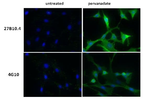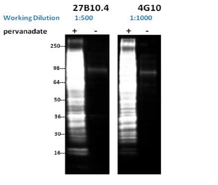 Clones 27B10.4 and 4G10 were used to detect phosphotyrosine-proteins in pervanadate-treated NIH3T3 cells. Both antibodies detected enhanced accumulation of phosphotyrosine-proteins in treated cells. Clone 27B10.4 consistently showed higher signal intensity than 4G10 (Fig. 2).