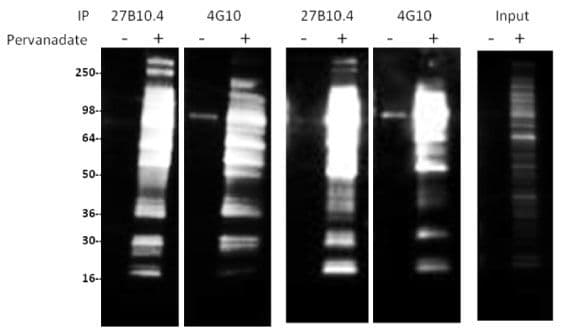 Great strides have been made in the development of phospho-specific antibodies, however, the use of a pan-phosphotyrosine antibody, coupled with immunoprecipitation of the protein under investigation, is still often the only way to track the phosphorylation of many proteins, particularly if multiple phosphorylation sites are involved. In this study, clone 27B10.4 was demonstrated to enrich a more diverse set of phosphotyrosine-proteins than 4G10, making it a highly desirable reagent in this application.