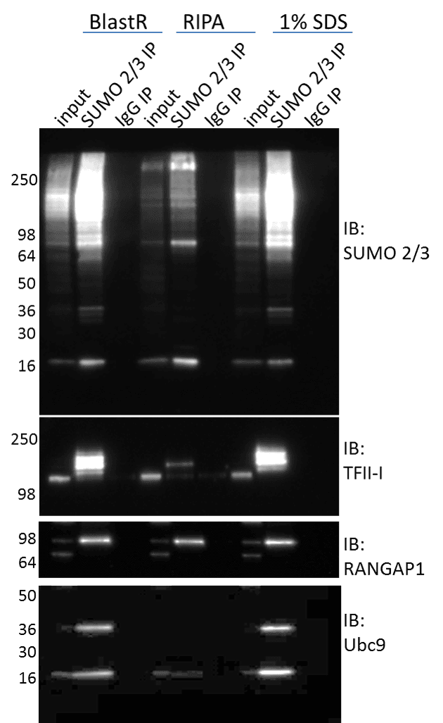 SUMO isopeptidases (deSUMOylases) can maintain a high level of activity in a variety of lysis buffers (e.g. RIPA), which results in loss of the SUMO modification6. This loss of SUMO signal makes detecting SUMO modified proteins challenging. One approach to inactivating deSUMOylases is to utilize denaturing lysis buffers. Figure 1 shows immunoprecipitation (IP) enrichment of total SUMO 2/3 profiles, as well as, target specific SUMO 2/3 modified proteins isolated from denaturing (BlastR and 1% SDS) versus non-denaturing (RIPA) lysis buffers. The total SUMO 2/3 signal is clearly reduced in non-denaturing lysate, and supports the established dogma whereby utilizing denaturing lysis buffers are necessary to preserve the SUMO 2/3 signal. When investigating target specific SUMO 2/3 modifications like TF-II or Ubc9, the signal is nearly undetectable when utilizing RIPA buffers.