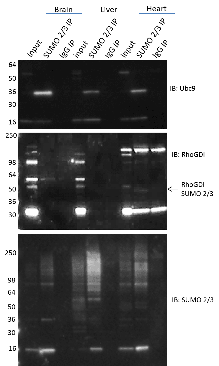 Investigation of SUMO 2/3 modified proteins in tissue is often desirable to translate findings from cell culture to animal models, as well as when investigating mechanistic causes of specific disease models. The (BK162) effectively isolates and enriches SUMO 2/3 modified proteins in both cell culture and tissue lysates. Mouse brain, liver, and heart were isolated, and the tissue was processed with the BlastR lysis system (see methods). SUMO 2/3 modified proteins were enriched from the various tissue lysates using ASM24-beads and the results show effective enrichment of total and specific SUMO 2/3 modified proteins (Figure 5). It is interesting to see the high variability in SUMO 2/3 signals between different tissue types. Note, that the SUMO 2/3 signal intensity for a specific protein (i.e. Ubc 9) does not correlate with the signal intensity observed for the total SUMO 2/3 protein profile. These data highlights the importance of investigating both total as well as target protein specific SUMO 2/3 changes. It was also intriguing to find specific SUMO 2/3 modification of RhoGDI in heart tissue, but not brain or liver in wild type mice. It will be interesting to determine if this is mechanistically important, in regulating RhoGDI in heart versus other tissue types. Additionally, it will be interesting to determine if the RhoGDI SUMO 2/3 state is activated in brain and liver in certain disease models.
