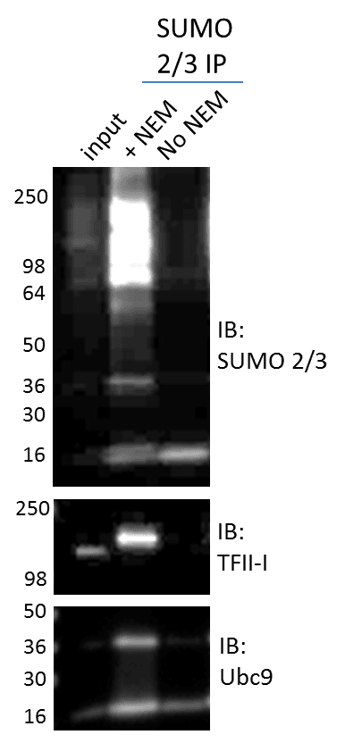 Additionally, data in figure 2 identify a simple approach for validating a SUMO 2/3 modification signal. Simply lysing cells with or without NEM allows the investigator to determine if the SUMO 2/3 signal is real, as the band should disappear when NEM in removed from the lysis buffer. While additional validation methods should also be performed, this experiment may provide additional confidence in a SUMO 2/3 result.